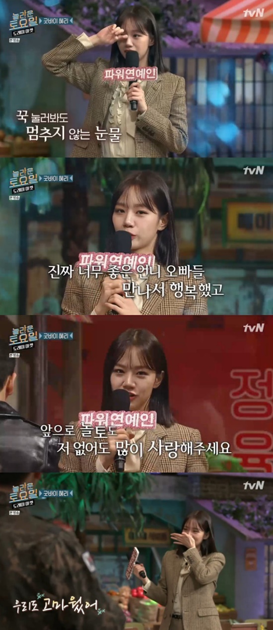 녹화 말미 혜리는 아쉬움의 눈물을 흘리며 마이크를 들었다. 그는 "어젯밤부터 준비한 말이 있는데… 진짜 너무 좋은 언니 오빠들 만나 행복했고 예쁨 받을 수 있게 해 줘 감사했다"며 "시청자들이 슬퍼하셨는데 내가 없어도 '놀토' 많이 사랑해달라"라고 하차 소감을 전했다. 이를 본 멤버들 역시 눈물을 흘렸으나, 이내 웃음을 주며 본인들만의 방식으로 혜리와 이별했다.